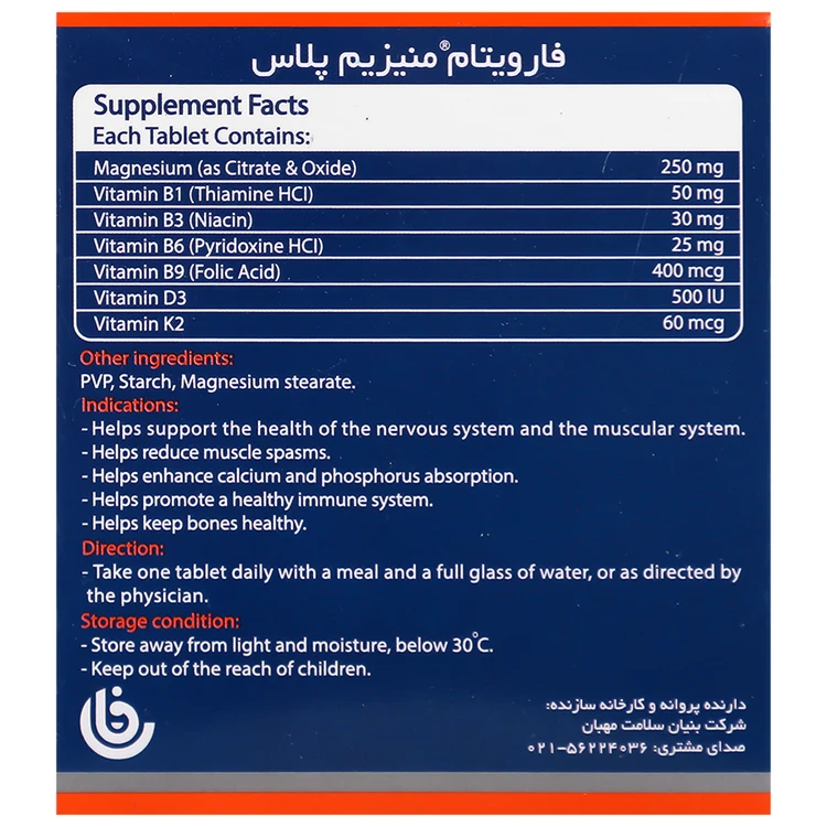 منیزیم پلاس فارویتام یک مکمل غذایی است که با هدف تقویت سیستمهای عصبی، عضلانی، استخوانی و ایمنی طراحی شده است. منیزیم پلاس فارویتام حاوی 250 میلیگرم منیزیم در دو فرم سیترات و اکساید در کنار ویتامینهای B، ویتامین D3 و K2 است.فارویتام منیزیم پلاس دارای منیزیم به فرم سیترات است که زیست فراهمی و جذب آن را افزایش میدهد.